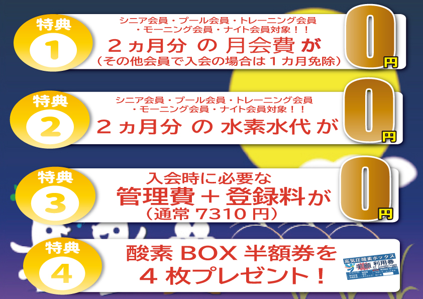 シニア・プール・トレーニング・モーニング・ナイト区分対象、水素水込みの入会で